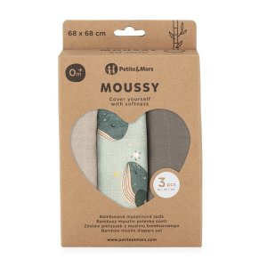 PETITE&MARS Súprava plienok bambusová mušelínová 3ks Moussy Whale Song 68 x 68 cm