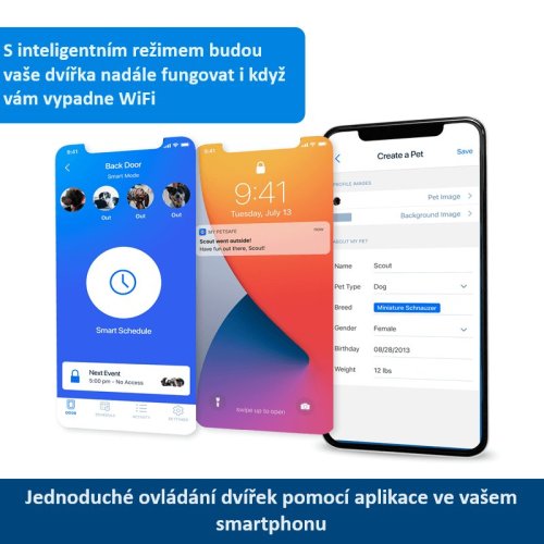 Možno budete chcieť nastaviť zákaz vychádzania pre svojho štvornohého priateľa. Prostredníctvom aplikácie My PetSafe® budete môcť svojim maznáčikom nastaviť individuálne plány, ktoré im umožnia prístup cez dvere len v konkrétnych časoch. Notifikácie o pohybe si môžete skontrolovať na telefóne alebo chytrých hodinkách. Dostávajte upozornenie, keď Vaši domáci miláčikovia použijú dvere, keď budú zamknuté a podobne. Pokiaľ sa mestom preženie búrka, aktivujte pomocou telefónu na diaľku viacbodový zámok na dverách, aby Váš pes alebo mačka zostali v bezpečí. Dynamické tesnenie dvierok je energeticky účinné a udržuje nežiaduce počasie a prievan tam, kam patrí - mimo Váš domov. Klapka (flap) dvierok je vyrobená z odolného plastu a je tónovaná na zachovanie súkromia, takže do Vášho domova nebudú nazerať žiadne zvedavé oči. Dvierka SmartDoor sa dodávajú v 2 veľkostiach: MEDIUM a LARGE. Sú napájané batériami alebo adaptérom (predáva sa samostatne) a vyžadujú vysokorýchlostné Wi-Fi pripojenie s frekvenciou 2,4 GHz. Inštalácia dvierok bude perfektný víkendový projekt. Váš maznáčik si zaslúži to najlepšie.