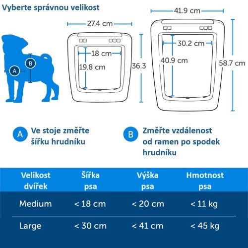| Veľkosť dvierok | Veľkosť psa / mačky | Veľkosť prechodového otvoru | Vonkajšie rozmery rámu | Veľkosť montážneho otvoru |