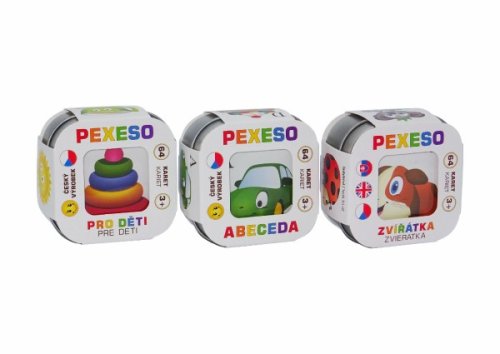 Pexeso patrí medzi najobľúbenejšie detské hry. Tieto pexesá ešte navyše deti rozvíjajú. Krabička obsahuje tri menšie plechové krabičky, v ktorých nájdeme tri rôzne pexesá. Jedno pexeso sa zameriava na Abecedu, druhé na Zvieratká + angličtina a tretie Pre deti. Rozmery balenia 21 x 8 x 4 cm. Vhodné pre deti od 3 rokov.
