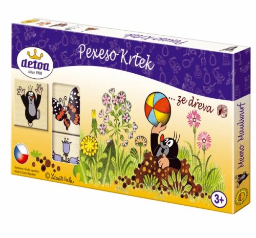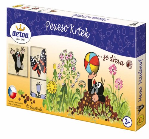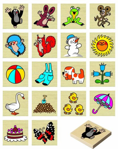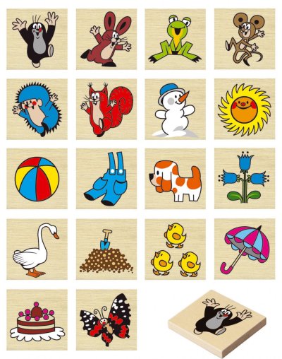 Pexeso z drevených kameňov s rozmermi 40x40x6mm s veselými obrázkami Krtka a jeho priateľov. Precvičovanie a sústredenie pamäte detí.