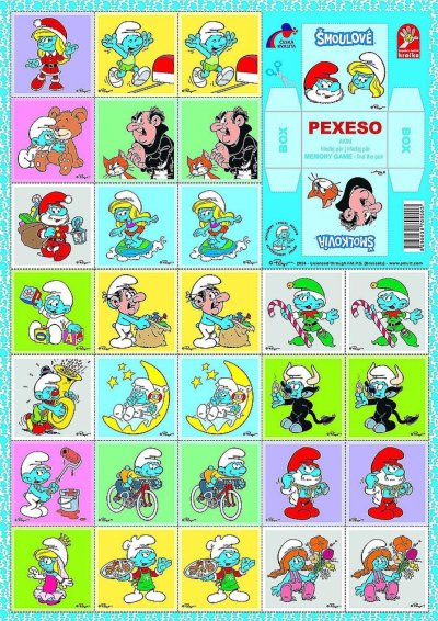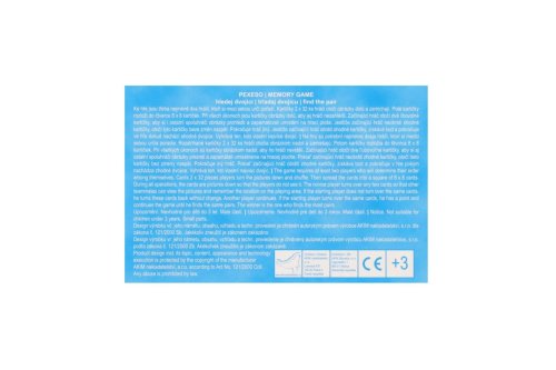 pevný kartón s lesklou vodoodpudivou povrchovou úpravou, veľkosť kartičiek 4 x 4 cm (š xd), na pexesoch pri titulnom obrázku umiestnený box na vystrihnutie pre možnosť vloženia vystrihnutých kartičiek.