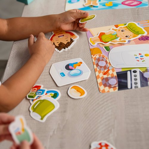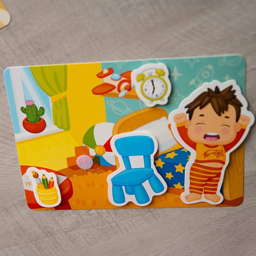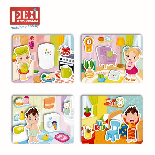 Trénujte koordináciu ruka - oko, jemné motorické zručnosti a spoznajte deatily svojho každodenného života. Vybavte si vlastnú domácnosť! Kam patrí hrniec - do kuchyne alebo do vane? A kde si má chlapec vyčistiť zuby? Nájdite správne odpovede a rozmiestnite predmety na ich miesta v každej miestnosti. Čo je vo vnútri?Sada obsahuje 4 pružných veľkých plastových doštičiek so suchým zipsom a 20 samostatných dielikov, ktoré umiestnite na doštičky pomocou suchého zipsu. Vďaka tejto vychytávke jednotlivé diely len tak nespadnú a budú držať na správnom mieste. Všetky časti sú vyrobené z odolného, ale tenkého plastu so špeciálnou povrchovou úpravou, ktorá je deťom príjemná na dotyk. Ako hrať? Berte jednotlivé dieliky jeden po druhom a rozprávajte deťom čo na nich je . Potom vezmite doštičku s obrysmi predmetov a vyzvite dieťa, aby našlo správny predmet pre každý obrys a pripevnilo ho pomocou suchého zipsu na správne miesto. Hlavné vlastnosti: zlepšuje motorické schopnosti trénuje vyjadrovanie a hovorenú reč rozvíja myslenie a pamäť upevňuje udržanie pozornosti