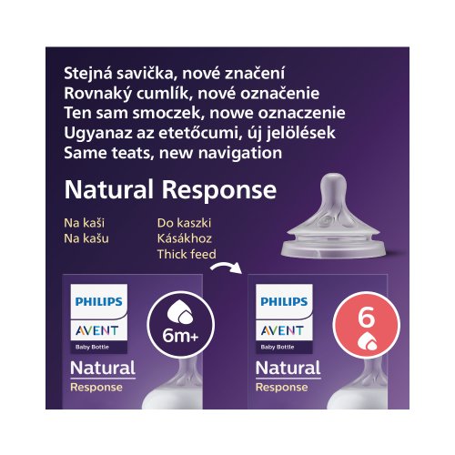Vyberte pre vaše dieťa cumlík so správnym prietokom Každé dieťa sa kŕmi inak a vyvíja sa vlastným tempom. Navrhli sme niekoľko rýchlostí prietoku, aby ste mohli pre vaše dieťa nájsť ten správny a fľašu si tak prispôsobiť. Všetky cumlíky Natural Response sú vyrobené z mäkkého silikónu.