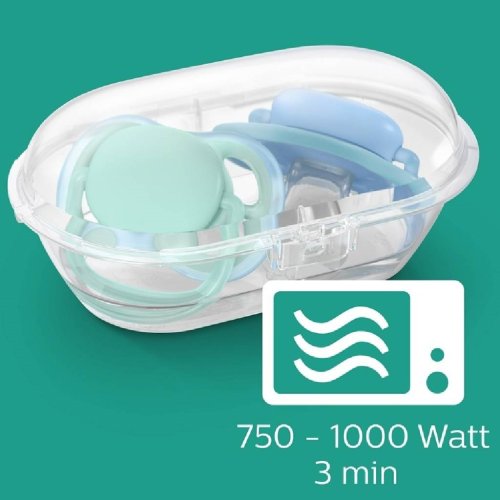 Sterilizačná/transportná krabička umožňuje sterilizovať cumlík v mikrovlnnej rúre a nosiť so sebou.