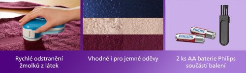 Noste svoje obľúbené kúsky oblečenia oveľa dlhšie! S výkonným odžmolkovačom Philips v priebehu niekoľkých okamihov zlepšíte ich vzhľad a budete ich opäť nosiť s radosťou. Prístroj je vybavený britom, ktorý za jednu minútu vykoná až 8 800 otáčok pre tie najlepšie výsledky. Na jeho hlavici nájdete otvory troch veľkostí na odstránenie rôzne veľkých žmolkov . Hodí sa aj na úpravu pokrývok a ďalších tkanín. Zozbierané žmolky sa koncentrujú v odnímateľnom zásobníku , ktorý je možné ľahko vysypať. Súčasťou balenia je kryt na odžmolkovanie veľmi jemných látok, čistiacu kefku a 2 ks AA batérie Philips.
