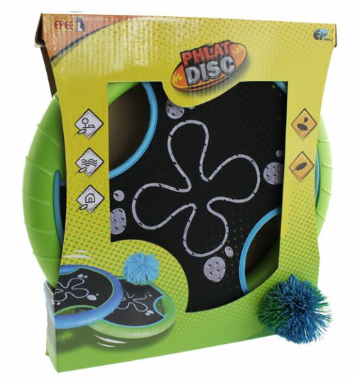 Phlat disc! Revolučná zábava doma i vonku. Chlpatý loptička a disk s textilným stredom. Pinkejte si sami, pinkejte si medzi sebou. Cez sieť alebo len tak. Trefujte sa kamkoľvek, súťažte, kto dopinknete čo najďalej. Proste si pinkejte. Doma, v parku, na záhrade, na pláži, na kúpalisku. Určite vás to chytí. A to nie je všetko. Môžete si s ním hádzať aj ako s lietajúcim tanierom. Je to proste Phlat disc zábava.