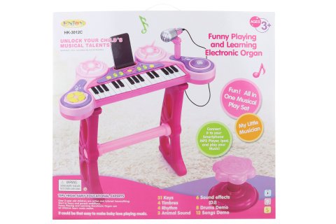 Plastové piano so stoličkou. Na piane je možné okrem klasických tónov tiež navoliť rôzne podkresové melódie a meniť hudobné nástroje. Súčasťou je aj mikrofón a konektor pre pripojenie MP3 prehrávača. Piáno je na batérie (3 x AA - nie sú súčasťou). Súčasťou je aj detská stolička. Rozmery piana cca 49 x 24 x 57 cm. Rozmery balenia cca 55,5 x 54 x 8 cm. Vek 3+
