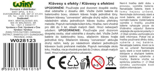 Piánko so zvukovými efektmi. Veľkosť 32 cm. 2 režimy - 8 skladieb, jednotlivé tóny. 2 varianty - modrá, ružová. Voľba režimu klávesom "Conversion". 2xAA batérie nie sú súčasťou.