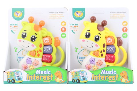 Plastové piánko v tvare žirafy. Hrá a vydáva zvuky zvieratiek. Napájanie na 2 AAA batérie (sú súčasťou balenia). Rozmery piánka cca 12 x 16 cm. Rozmery balenia cca 16 x 19 x 5 cm. Vek 12m+