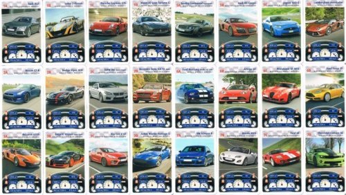 Karty pre obľúbenú detskú hru kvarteto s obrázkami športových áut. Karta každého auta obsahuje nasledujúce technické údaje: objem motora, počet valcov, hmotnosť, z 0 na 100 km, h, výkon motora a najvyššiu rýchlosť.