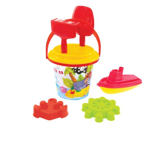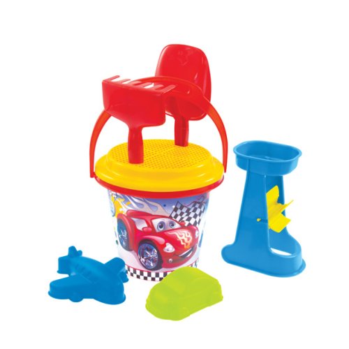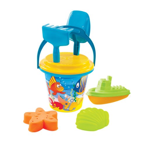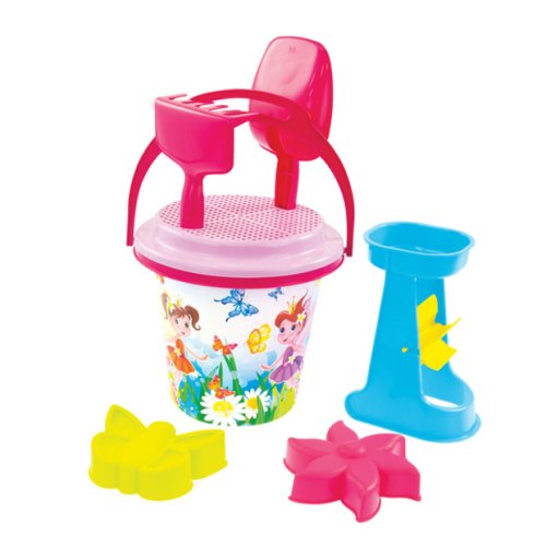 Piesková sada s vodným mlynčekom alebo lodičkou v piatich designoch – víly, dinosaurie, piráti, princezné a rybičky. Sada obsahuje kýblik o veľkosti 3,2 l, hrabličky, lopatku, sitko, vodný mlynček alebo lodičku a dve tematické bábovky. Vyrobené v EÚ z kvalitného plastu. IML.