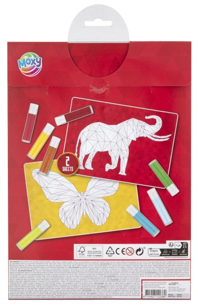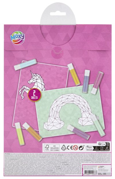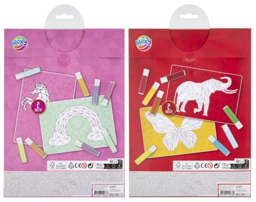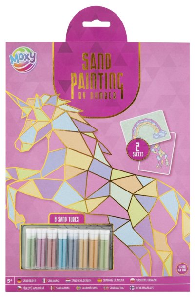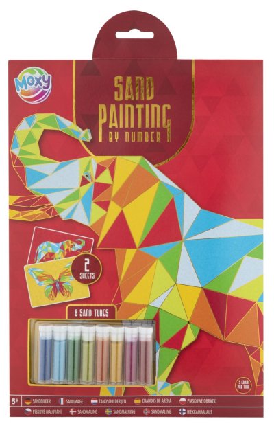 Pieskové maľovanie pomocou čísel Jednorožec/Dúha a Slon/motýľ – veľkosť obrázku A4. Balenie obsahuje dva obrázky s lepiacou plochou, 8 farebných pieskov v sklenenej skúmavke (modrozelený, ružový, červený, sv.modrý, tm.modrý, žltý, béžový a zelený. Postup – najprv odlepte okrajovú časť obrázku, ktorú posypte pieskom, nadbytočný piesok vráťte do skúmavky.