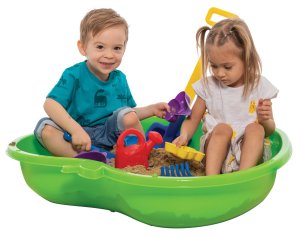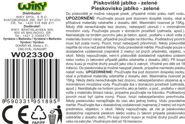 Plastové pieskovisko v tvare jablka. Pri kúpe dvoch kusov môže druhý kus slúžiť ako veko (výrobok je uspôsobený na vzájomné prepojenie).