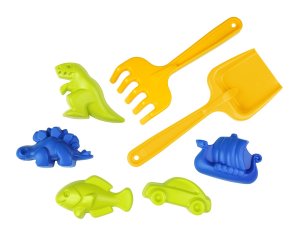 Sada obsahuje 7 dielov pomôcok na piesok a to hrable, lopatku a 5 ks formičiek (2x dinosaurus, 1x autíčko, 1x rybka, 1x lodička). Súprava je vyrobená z kvalitného materiálu, ktorá je bezpečná pre deti. Je navrhnutá pre deti od 1 roku veku, čo zaisťuje bezpečné a zábavné hranie pre najmenšie deti. Podnecuje deti k rozvoju ich kreativity, zručnosti a tiež fantázie ako na pieskovisku, tak na pláži .