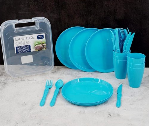 Praktická sada plastového riadu pre pikniky a vonkajšie stolovanie. Všetko uložené v kompaktnej úložnej krabičke s klipom pre ľahké prenášanie.