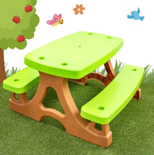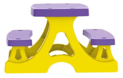 Piknikový stolík s dvoma lavicami z kvalitného plastu žlto-fialový.