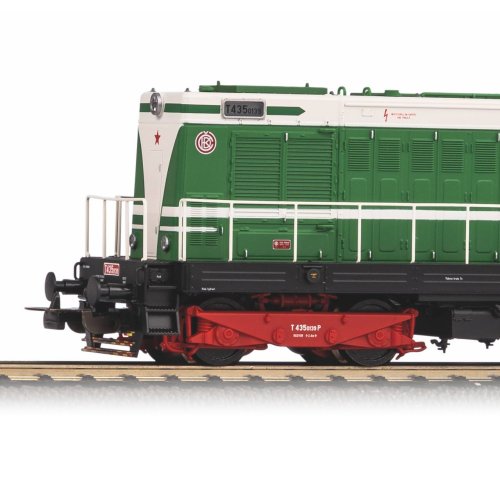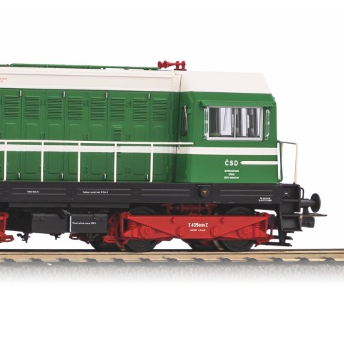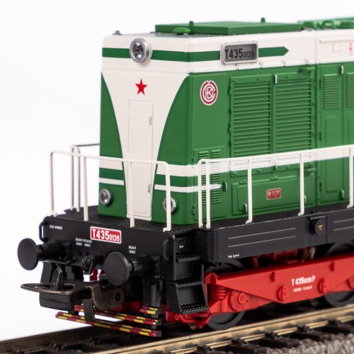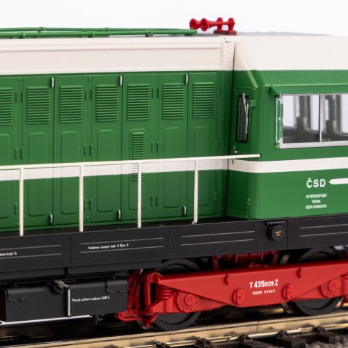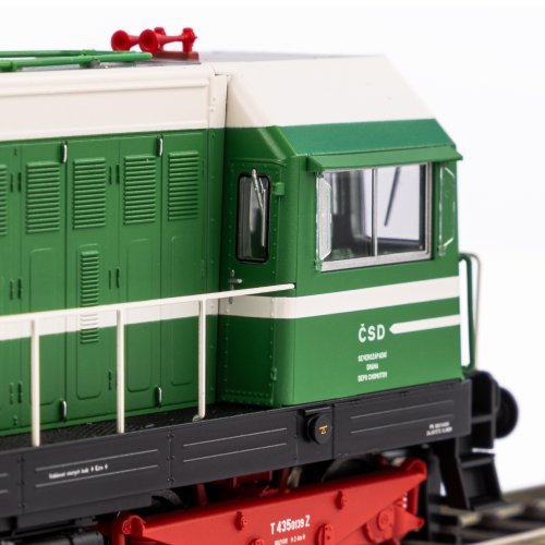 Model štvornápravovej diesel-elektrickej lokomotívy T 435 „Hektor“ Československých štátnych dráh, najčastejšie slúžiaci na posúvanie a pohon ľahkých nákladných súprav. Pre vysokú spoľahlivosť a jednoduchú obsluhu sú tieto stroje dodnes prevádzkované súkromnými spoločnosťami na vlečkách priemyselných podnikov a pri údržbe tratí. Vďaka pozornosti venovanej detailom môžete obdivovať rozdielne podvozky odlišujúce staršie a novšie série lokomotívy, a to samozrejme vrátane usporiadania sústavy bŕzd. Precízne spracovaná karoséria neopomína ani najjemnejšie prelisy vo dvierkach údržby, ktoré oživujú jej spartánsky charakter. Dojem autenticity umocňuje prvotriedne lakovanie starostlivo vybranými odtieňmi a potlač najvyššej kvality. Dokonale čírymi okienkami je možné nazerať do náležite upraveného interiéru kabíny. Stroj zdobí rad dodatočne pripojených prvkov, medzi ktorými sa vyníma najmä zábradlie, ale patrí k nim aj podrobne zhotovený systém chladenia a elektrické vedenie na streche. Na účely vystavenia vo vitríne je možné model navyše doplniť detailmi tiahlového ústrojenstva, ktoré sú súčasťou balenia. Výkonný motor je vybavený rozmernými zotrvačníkmi a moment je prenášaný prostredníctvom dvojice uhlopriečne usporiadaných bandážovaných kolies na vnútorných nápravách, poháňané sú však všetky dvojkolesia. V súčinnosti s ťažkým, precízne navrhnutým a zostaveným zinkovým podvozkom je tak výsledkom vysoká ťažná sila a bezchybne plynulý chod. Trojica svetiel na čelách sa rozsvieti a mení farbu v závislosti od smeru jazdy. Osvetlením je vybavená ako kabína rušňovodiča, tak aj pútavý detail v podobe prevádzkového čísla stroja. Nielen pokročilé riadenie svetiel je možné dosiahnuť zabudovaním digitálneho ovládania. Model je možné rozšíriť zvlášť určeným digitálnym dekodérom so zvukovým modulom a reproduktorom. Hlavné vlastnosti: analógové ovládanie napájania DC štvorica náprav motor s dvojicou zotrvačníkov dvojice bandážovaných hnacích kolies svetla s prepínaním farby podľa smeru jazdy a svetlo kabíny rušňovodiča a prevádzkového čísla rozhrania PluX22 podľa NEM 658 šachta podľa NEM 36 brožúra pre BR 107/T 435 (DE)všeobecné informácie pre BR 107/T 435 (DE, EN, FR, NL)návod na obsluhu a zoznam náhradných dielov modelu č. 52434 (DE, EN, SK)
