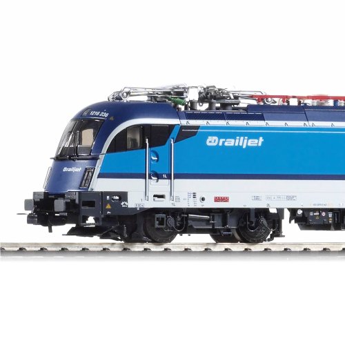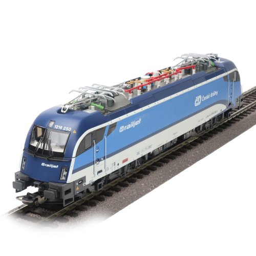Model najmodernejšej štvornápravovej elektrickej lokomotívy Rh 1216 Taurus III v prevedení Railjet Českých dráh, využívanej predovšetkým na ťahanie medzinárodných osobných vlakov. Elegantný a úspešný stroj vyrábaný firmou Siemens je držiteľom rýchlostného rekordu z roku 2006 a je možné ho vídať na tratiach naprieč celou Európou . Prvotriedne spracovanie dáva vyniknúť mimoriadnej bohatosti detailov podvozku verne zachytávajúcich aj najmenšie podrobnosti brzdového ústrojenstva. Vyniká tu tiež vysoko kvalitná potlač s množstvom kontrastných piktogramov. Prísne aerodynamická karoséria je doplnená citlivo zakomponovanými a dôkladne spracovanými stupienkami a madlami. Energický charakter stroja dokonale dotvára precízne lakovanie zdôrazňujúce ako hlavné línie, tak aj drobné detaily výlisku. Strechu potom zdobí ohromujúci rad dodatočne pripojených súčastí, ktorým dominuje štvorica pantografov autenticky odrážajúcich prevedenie lokomotívy pre České dráhy . Pohon modelu zaisťuje výkonný motor s rozmernými zotrvačníkmi, ktorý je spolu s ťažkým, precízne navrhnutým a zostaveným zinkovým podvozkom. Moment je prenášaný prostredníctvom dvojice uhlopriečne usporiadaných bandážovaných kolies na vnútorných nápravách, poháňané sú však všetky dvojkolesia. Trojica svetiel na čelách sa rozsvieti a mení farbu v závislosti od smeru jazdy. Lokomotíva je vybavená digitálnym dekodérom so zvukovým modulom a reproduktorom, ktorý obsahuje knižnicu zvukov verných predlohe a umožňuje pokročilé ovládanie svetiel. Je kompatibilný s protokolmi DCC, Rail-Com® a Motorola®, a umožňuje aj prevádzku v analógovom režime. Príslušný prevádzkový režim vie sám múdro rozoznať. S ovládacími jednotkami PIKO SmartControl, alebo aj jednotkami kompatibilnými s formátom mfx®, ponúka široké možnosti individuálneho mapovania. Hlavné vlastnosti: napájanie DCdigitálne ovládanievstavaný digitálny dekodér so zvukovým modulom a reproduktoromštvorice nápravmotor s dvojicou zotrvačníkovdvojica bandážovaných hnacích kolsvetla s prepínaním farby podľa smeru jazdyštvorice pantografovrozhranie NEM 652šachta podľa NEM 36 k Rh 1216 Taurus (DE, EN, FR, NL)návod na obsluhu a zoznam náhradných dielov modelu č. 59845 (DE, EN, FR, CZ) návod na obsluhu digitálneho dekodéra č. 56615 (DE)návod na obsluhu digitálneho dekodéra č. 56615 (EN)