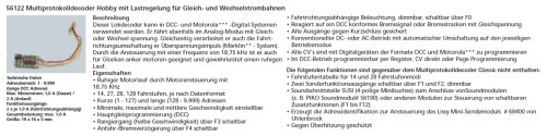Malý, výkonný multiprotocol dekodér. Môže byť použitý so systémami DCC a Motorola®. Pracuje aj v analógovom režime s jednosmerným napätím. Spracováva aj prepínanie smeru jazdy pomocou prepäťových impulzov (systém Märklin). Dekodér pracuje s frekvenciou 18,75 kHz a je tak vhodný aj pre plynulú prevádzku s motormi využívajúcimi obežný rotor (Glockenanker). Hlavné vlastnosti: rozhranie NEM 652 (8pin) Dokumentácia: Manuál (EN)Tabuľka konfigurácií (EN)