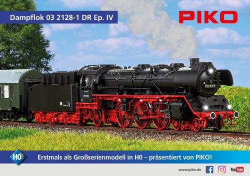 Novinka pre rok 2025: Od roku 1969 prišiel rad na parné lokomotívy radu 03, ktoré boli prestavané pre ďalšie roky prevádzky. Hlavný dôraz bol kladený na generálnu opravu kotla, vrátane zmiešaného predhrievača, prepracovaného vertikálneho kotla a popolníka. Lokomotívy sa tiež dočkali reorganizácie čerpadiel, charakteristického systému zmiešaného predhrievača na dymovej komore a novej strechy na kabíne. Rekonštruované lokomotívy slúžili v diaľkovej doprave počas dobrého desaťročia. Špecifikácia: napájanie DCanalógové ovládanie dĺžka s nárazníkmi 275 mmšachta NEM minimálny rádius 422 mm2 bandážované koladigitálne rozhranie NEM 658 PluX22zvuk – nie, dodatočná montáž zvukového dekodéra PIKO, číslo produktu 56620 osvetlenie - biela/červená svieti v závislosti od smeru 56163digitálne prepínateľné osvetlenie kabíny a osvetlenie ohniska (s dekodérom PluX22) Hlavné vlastnosti: realistické farebné prevedeniedetailné spracovanieatraktívny design