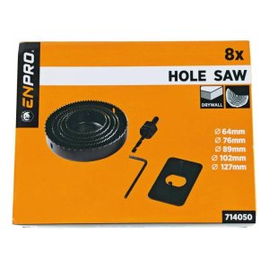 píla vykružovacia - sada 8 ks na vykružovanie dier do dreva, sadrokartónu, preglejky a pod priemermi: 64; 76; 89; 102; 127 mm imbus + hlavička max. hĺbka vrtu: 25 mm balené v praktickom plastovom kufríku