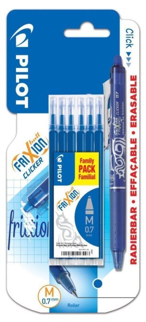 Napíš... Vygumuj... A prepíš s rollerom FriXion so stiskacím mechanizmom! Vygumujte bezo zvyškov pomocou tepla, ktoré vzniká trením gumovacieho hrotu FriXion o papier, a ktorý nezanecháva žiadne zvyšky. Použite rovnaké pero (atrament) na písanie a prepísanie. Blister obsahuje 6ks modrej. Šírka stopy 0,7mm