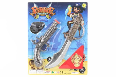 Sada pirátskych zbraní Puška veľkosť cca 25,5 cm, mačeta cca 32 cm, šatka, odznak, plastový kryt na oko. Materiál plast. Rozmer balenia 38 x 31 cm. Vek 3+