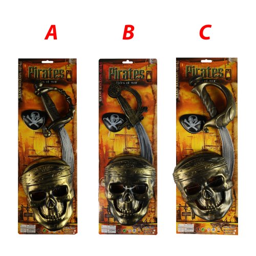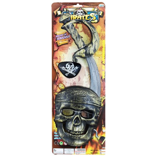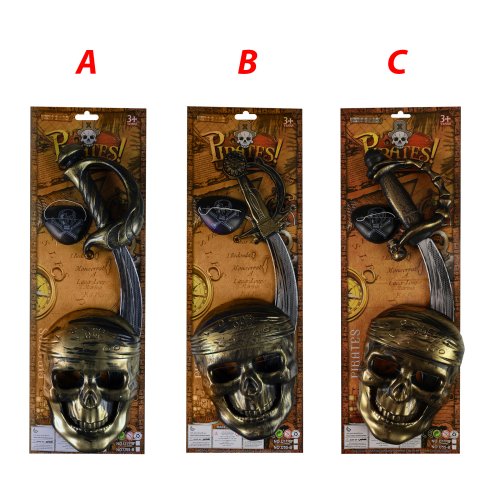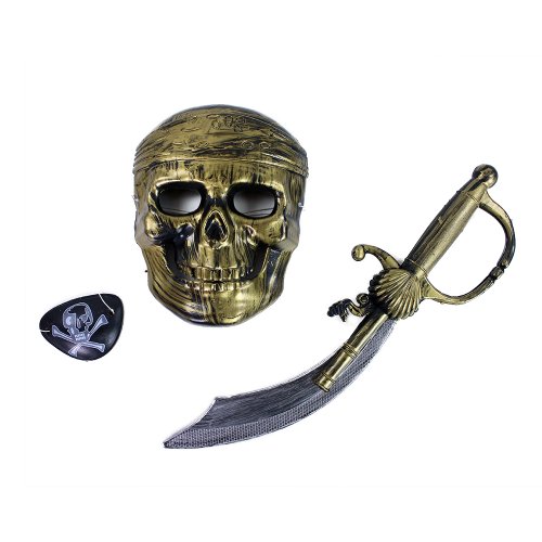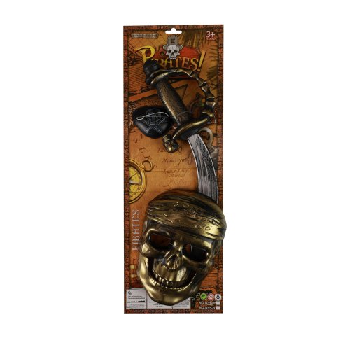 Exkluzívna sada pre všetkých malých pirátov! Tento parádny set obsahuje bronzovú masku na gumičku, klapku na oko a meč s bronzovou rukoväťou. Tieto super doplnky sú ideálne na pirátsky kostým! Všetko je vyrobené z PVC.
