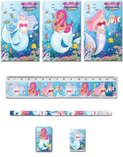 Sada písacích potrieb s motívom morských víl. Set obsahuje bloček s rozmermi 8,5 x 5 cm, ceruzku, ostrohovátko, mazaciu gumu a pravítko s dĺžkou 15cm. Poznámka: Fotografia je ilustratívny motív sa môže mierne líšiť.