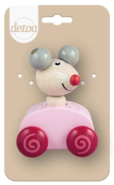 Drevené pískacie zvieratko v tvare myšky, po stlačení hlavičky zapíšu. Kolieska sú funkčné, v ružovom prevedení. Vhodné pre deti od 1 roku.