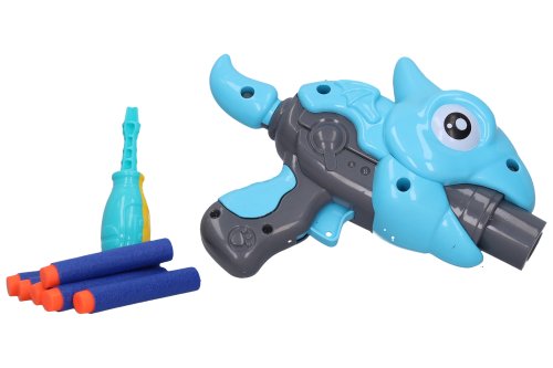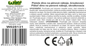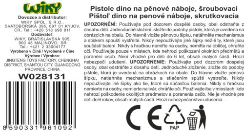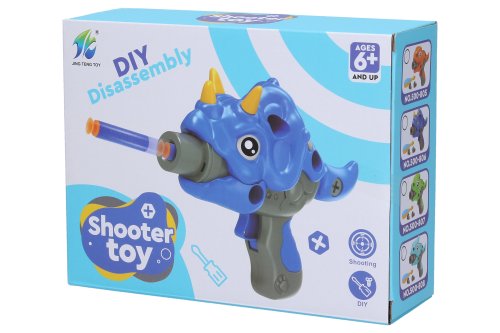 Pištoľ na penové náboje. Skrutkovacie stavebnice s motívom dinosaurov. Veľkosť zostavenej pištole 21 cm. Balenie obsahuje dieliky pištole, skrutky, skrutkovač, 6 penových nábojov. Vystreľovací mechanizmus na natiahnutie (chvost).