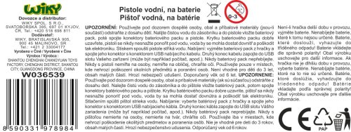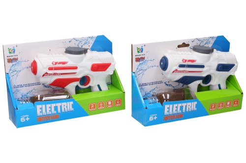 Pištoľ vodná elektrická. Veľkosť 18 cm. Zásobník na 200 ml. Dostrel 5 – 8 metrov. 1x3.7V batériový pack a USB nabíjací kábel súčasťou, skrutkovač na otvorenie krytky. 2 varianty - modrá, červená.
