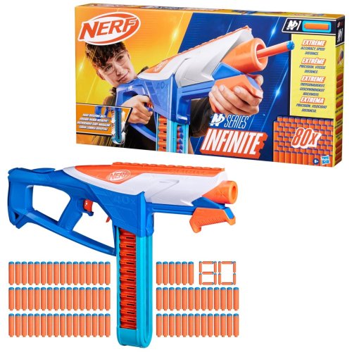 Pištoľ Hasbro Nerf N Series Infinite prináša poriadnu dávku akčnej zábavy! Vďaka zásobníkovému pásu s kapacitou 40 šípok a balenia s celkom 80 šípkami si deti užijú dlhé bitky bez zbytočných prestávok. Perfektná voľba pre všetkých, ktorí chcú v Nerf súboji dominovať rýchlosťou aj presnosťou.