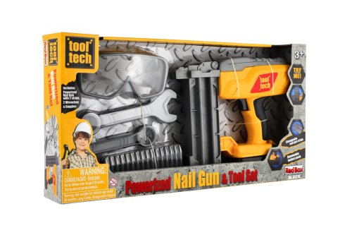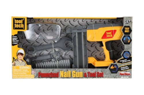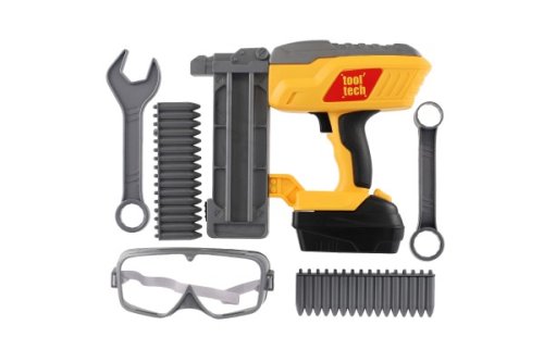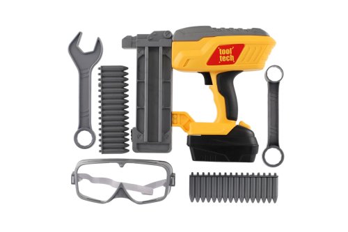 Nádherná sada pre malých domácich majstrov. Súprava obsahuje ochranné okuliare, kľúče, plastové náboje klince a samozrejme nastreľovaciu pištoľ. Užijete si tak veľa zábavy pri drobných opravách. Pištoľ má vyberateľný pack, kde sú uložené batérie. Batérie 2x AA sú súčasťou balenia. Rozmery balenia 42 x 22 x 7 cm. Vhodné pre deti od 3 rokov.