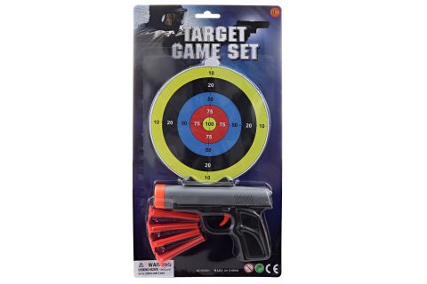 Sada pištole na náboje s prísavkou a terče. Balenie obsahuje 4 ks nábojov. Materiál plast. Balené na karte. Rozmery balenia cca 34x18x2 cm. Rozmery pištole cca 14,5x9 cm. Vek 8+