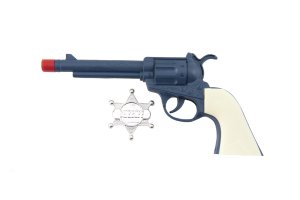 Život kovboja je snom množstva chlapcov. S touto sadou a pištoľou sa svojmu snu ľahko priblíži. Pištoľ pre všetky malé pištoľníky a kovboje. Puška vydáva klapací zvuk. Sada obsahuje aj odznak a plagátik hľadaného zločinca. Rozmery balenia 15 x 31 x 4 cm. Vhodné pre deti od 3 rokov.