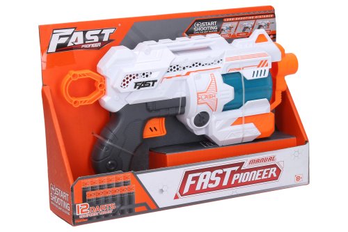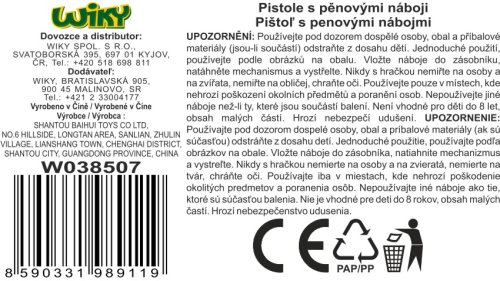 Pištoľ s 12 penovými nábojmi. Rozmery 25x6x14 cm. Naťahovacie nabíjanie. Obrázkový návod na použitie na prednej strane obalu.