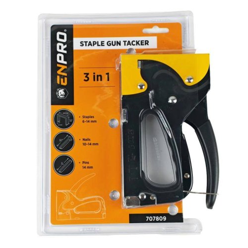 pištoľ sponkovacia 3 v1 ENPRO robustné kovové telo dĺžka spôn: 6 - 14 mm určená pre čalúnenie, prichytenie izolačných fólií, parozábran, papiera, kartónu, kobercov náhradné klince 14 mm - kód 708030