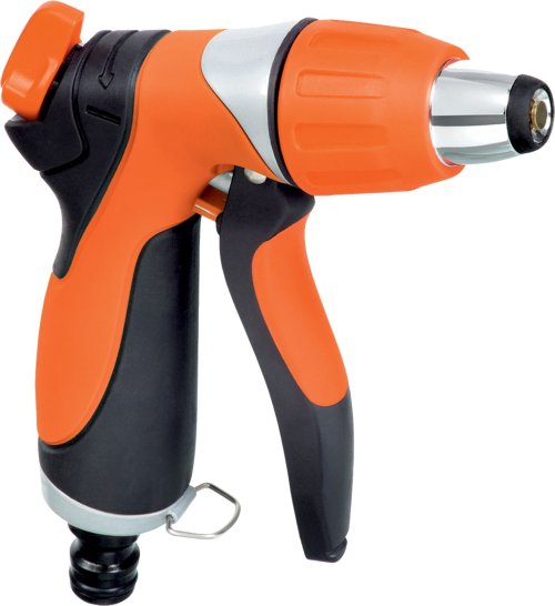 Postrekovacie pištoľ kovová s protišmykovým ergonomickým držadlom, gumenou hlavou, plynulou reguláciou rozstreku, jednoducho ovládateľnú vpredu umiestnenú aretáciou, s reguláciou prítoku vody so skvelým dizajnom a funkčné zdatnosťou.