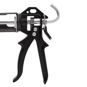 tuhý oceľový piest vytláčajúci hmotu široký pevný uzáver tlačiaci tyčinku dvojitá aretácia uzáveru silná oceľová matica spájajúca rám s telom široký a hrubý plech zaisťujúci pevnosť výtlačnej pištole