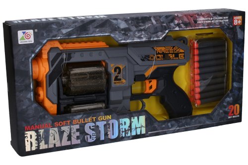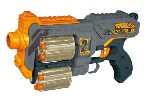Pištoľ Wheel Double s penovými nábojmi. Rozmery 32,5x19x6,3 cm. Súčasťou 20 penových nábojov (5 štandardných, 5 s prísavkou). Obrázkový návod s popisom na ovládanie na zadnej strane obalu. Streľba vložením náboja do zásobníkov, natiahnutím mechanizmu v zadnej časti zbrane, stlačením spúšte.