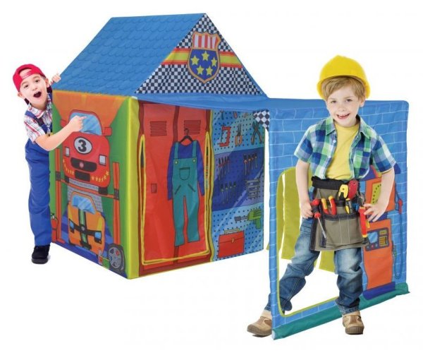 Detský stan s motívom dielne pre automechanikov. Stan zaujme svojou veselou farebnosťou na prvý pohľad a zaistí zábavu na dlhú dobu. Podporte fantáziu svojho dieťaťa a pomôžte mu postaviť stan, ktorý nemusí slúžiť iba pri hre na obchod. Rovnako dobre poslúži ako originálna skrýša alebo osobný kútik, kde môžu deti odpočívať. Stan je vyrobený zo 100% polyetera (PES) a obsahuje plastové skladacie tyče a spojnice. Stan je možné jednoducho postaviť aj zložiť. Rozmery stanu po zložení: 150 x 110 x 75 cm. Vhodné pre deti od 3 rokov.