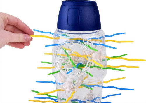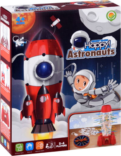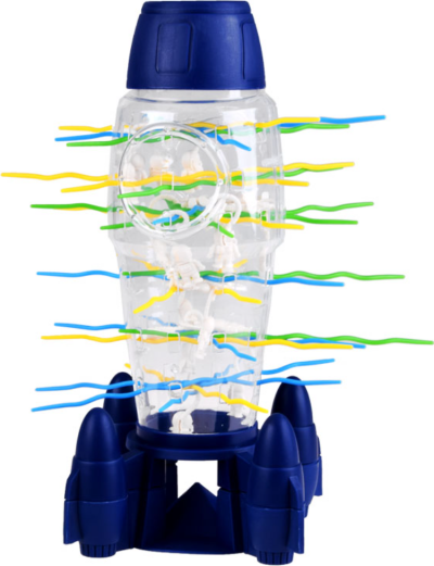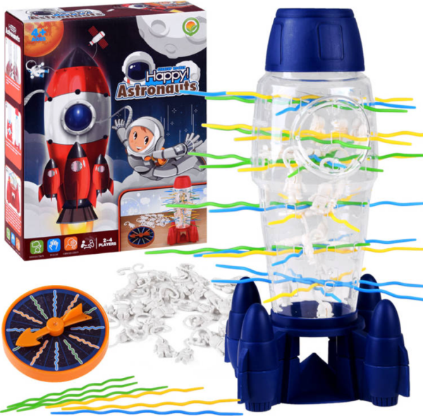 Zábava s astronautmi! Hra spočíva v umiestnení tyčiniek do otvorov rakety. Ďalej nasypete astronautov zhora do otvoru rakety tak, aby sa o zachytili o tyčinky. Potom hráči postupne točia šípkou na tachometri a podľa toho vyťahujú danú farbu tyčinky z rakety. Musíte dávať pozor, aby ste nenechali spadnúť astronauta, najlepšie žiadneho. Ten, komu spadne najmenej astronautov vyhráva. Sada obsahuje: - raketa - 30x figúrka astronauta - 30x tyčinka v troch farbách: žltá, modrá, zelená - točiaci tachometer Rozmery: - raketa 27 x 12 x 12 cm - tyče 17 cm - astronaut 4 cm x 1,5 cm x 0, 5 cm - tachometer: priemer 6,5 cm Táto hra je určená pre minimálne 2 hráčov od 4 rokov.