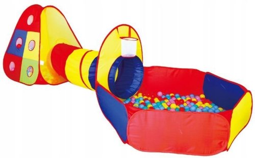 Herná sústava s detským stanom spojeným preliezacím tunelom s bazénom, ktorý je plný plastových loptičiek. Ideálna bunkrová základňa pre Vaše dieťa a jeho kamarátov. Detský set sa skladá zo stanu, spojovacieho tunela a ohrady s loptičkami. Farebný stan má jeden vchod a po stranách rôzne herné aktivity. Z jednej strany sú vrecká na hádzanie loptičiek az ďalšej strany je terč. Súčasťou bazénu s loptičkami je basketbalový kôš. Zostava je samorozkladacia a jednotlivé časti môžu stáť aj samostatne. Zostava je vhodná nielen do interiéru, ale môžete ho rozložiť aj na záhrade. Rozmery stanového setu sú cca 300 x 120 x 100 cm. Súčasťou stanového setu je aj 100 ks plastových loptičiek 3 ks malých loptičiek na hádzanie na terč. Vhodné pre deti od 3 rokov. Rozmer zloženého puzzle cca 51 x 50 x 19 cm