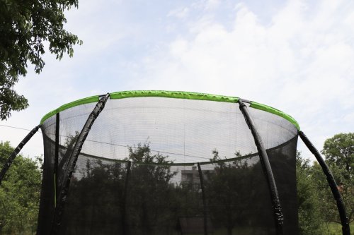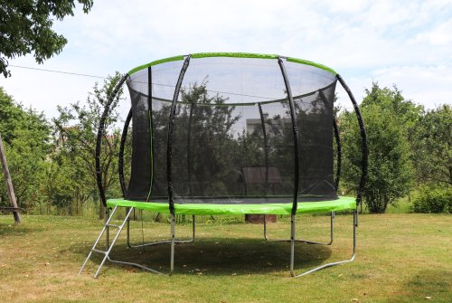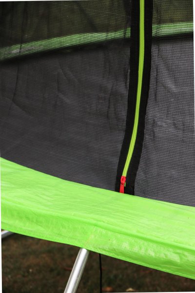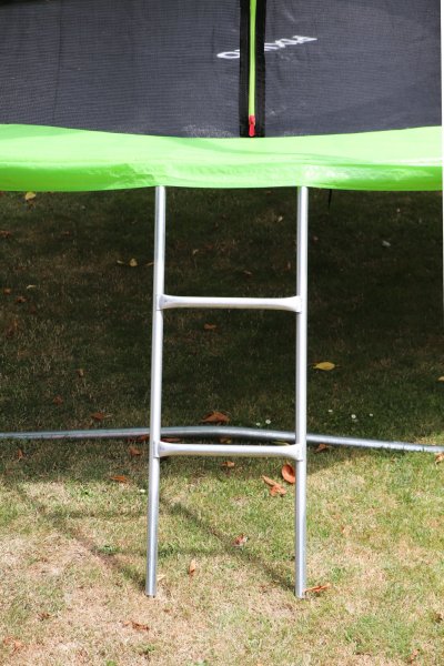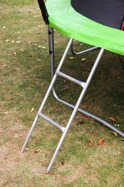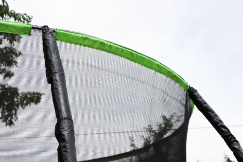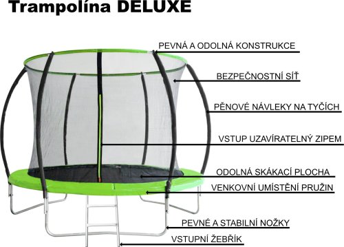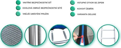 stabilné nohy v tvare písmena U odrazová plocha z kvalitného materiálu vnútorná bezpečnostná sieť (bráni doskoku do časti s pružinami) vstupný otvor so zipsom oceľová obruč bezpečnosťou siete elipsovité tyče ochrannej siete s bezpečnostným penovým krytom vonkajšie umiestnenie pružín s ochranným krytom kovový rebrík pre domáce vonkajšie použitie