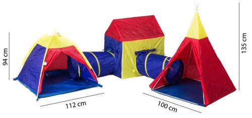 Herná sústava s dvoma tunelmi a tromi detskými stanmi pre nekončiace detské hrátky.