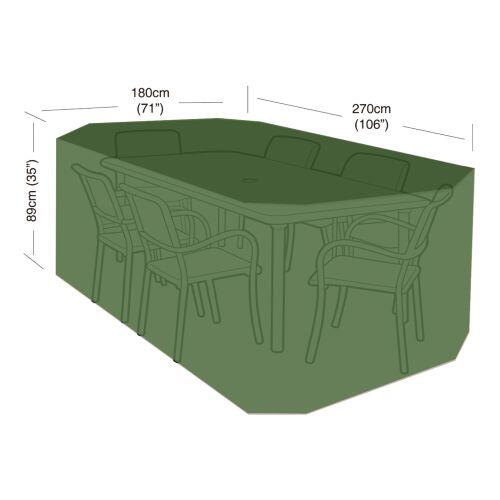 rozmery: 270 x 180 x 89 cm materiál: PE (polyetylén) 90 g/m2 farba: zelená Krycia plachta na set 6 stoličiek + obdĺžnikový stôl slúži na dlhodobé zakrytie a chráni pred dažďom, prachom a vetrom.