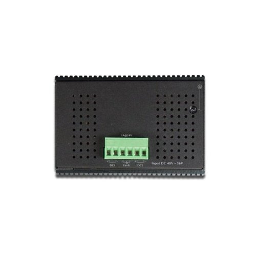 DIP prepínače pre aktiváciu Extend PoE módu 10Mb/s. Možnosť redundantného napájania DC 48~56V, krytie IP30, hliníková skriňa, pracovná teplota -40 až +75 °C.
