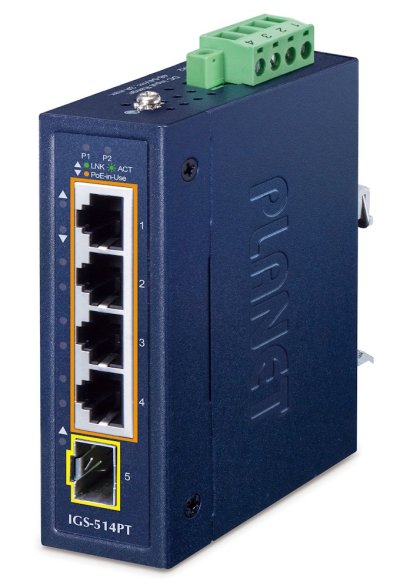 Kompaktný priemyselný switch ponúkajúci 4× RJ-45 10/100/1000 Base-T porty s podporou PoE+ (802.3af/at) a 1× 1000Base-SX/LX/BX SFP port. Podporuje napájanie až 30 W na port a celkový napájací PoE výkon 120 W.